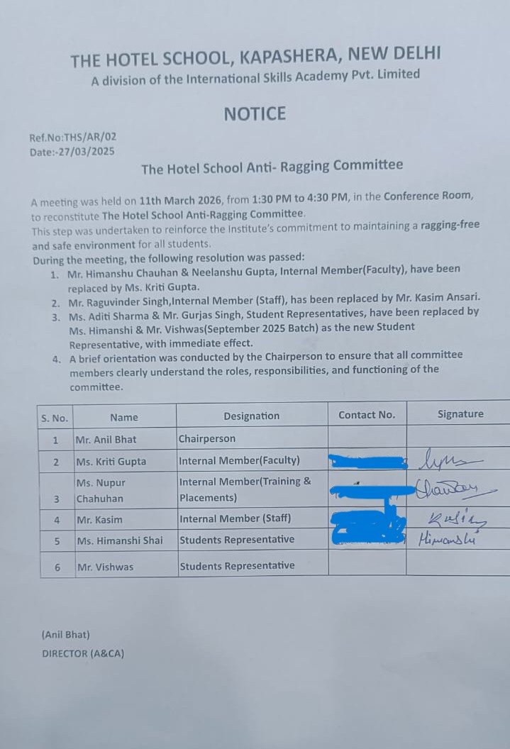 The Hotel School (THS), Kapashera, New Delhi, a division of International Skills Academy Pvt. Limited, is committed to maintaining a safe, respectful, and ragging-free campus environment.